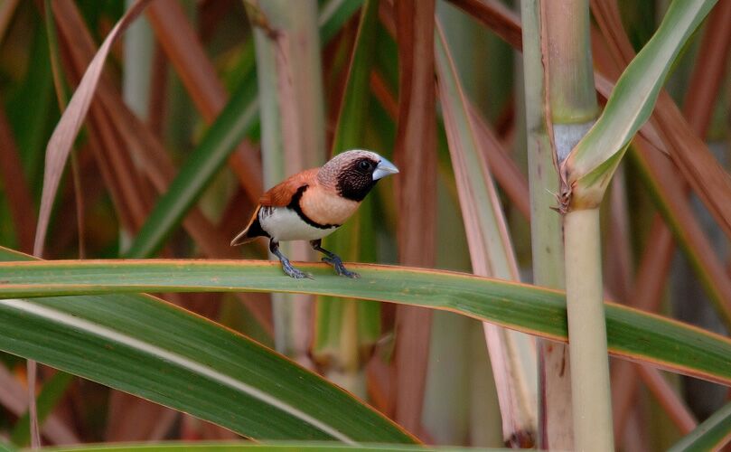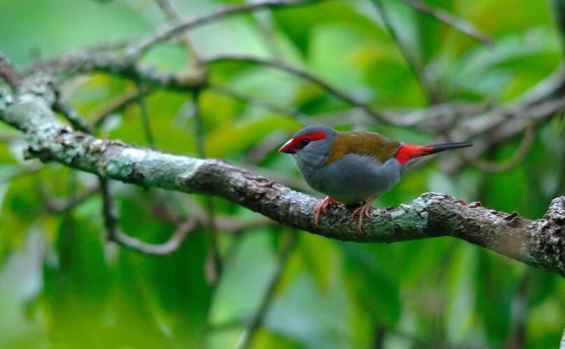 カエデチョウらしい派手な鳥です。赤い喙と過眼線が目立ちます。